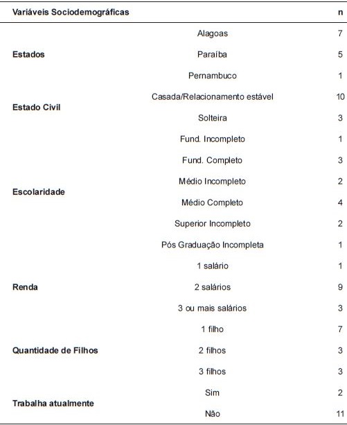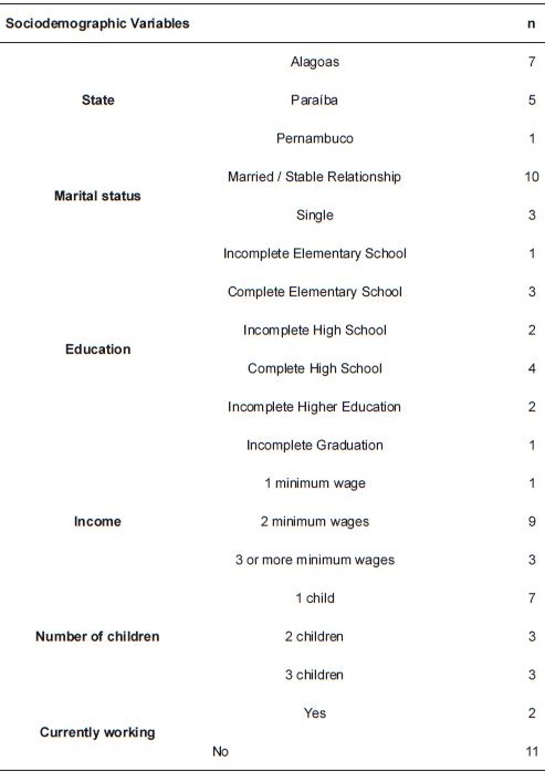 Tratou-se de um estudo exploratório, com abordagem qualitativa no qual participaram 13 mães de crianças microcefálicas, residentes em três Estados do nordeste brasileiro (Alagoas, Paraíba e Pernambuco). Na Paraíba, o local de encontro entre a pesquisadora e as participantes se deu na Fundação de Apoio ao Deficiente (Funad); em Alagoas, o local de encontro foi a Associação dos Deficientes Físicos de Alagoas. As participantes que tiveram dificuldades para ir aos locais de encontro, bem como a respondente do Estado de Pernambuco fizeram parte da pesquisa por meio de um aplicativo de mensagens instantâneas. A média de idade das participantes foi de 25 anos, variando entre 16 e 37 anos. A maioria era casada ou vivia em um relacionamento estável, possuía renda familiar de até dois salários mínimos e tinha apenas um filho, sendo a média da idade das crianças que tinham microcefalia de um ano e um mês, sendo sete destas crianças do sexo feminino. A Tabela 1 apresenta esses dados com maiores detalhes.