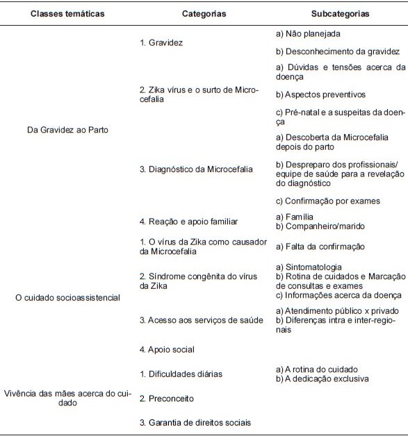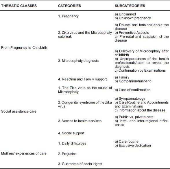 A segunda classe temática, classificada como O Cuidado socioassistencial, apresentou em sua primeira categoria O vírus da Zika como causador da microcefalia, sendo constatado que, das 13 mães entrevistadas, 11 relataram ainda não ter recebido a confirmação de que o diagnóstico de microcefalia do seu filho se deu pela infecção congênita pelo vírus da Zika. Assim, percebe-se uma lacuna no que diz respeito à confirmação da causa desse diagnóstico. Não se sabe se os resultados estão chegando para os profissionais e serviços e não estão sendo repassados para as principais interessadas ou se esses resultados nem estão chegando. Por se tratar de uma correlação nova entre causa (vírus da Zika) e efeito (microcefalia), é possível que haja demora na confirmação destes resultados. Entretanto, esta situação pode gerar ainda mais aflição às mães, uma vez que sequer a causa desta anomalia elas têm conhecimento.