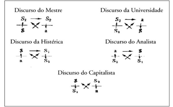 Desde a relação fundamental do significante (S1) com outro significante (S2), aparelho a partir do qual o sujeito ($) é efeito e o objeto a é o que causa o desejo do mesmo, é que o discurso se estabelece como meio da articulação entre linguagem e gozo. Segundo uma definição do próprio Lacan: “o discurso é o quê? É aquilo que, na ordem, no ordenamento daquilo que pode se produzir pela existência da linguagem, faz função de laço social” (1972, inédito). Assim, é possível afirmar que o discurso é o que estrutura o laço social a partir de elementos e de um ordenamento específico. Dessa maneira são coordenados quatro elementos - a, $, S1 e S2 - que são distribuídos por quatro lugares distintos - Agente, Outro, Produção e Verdade (Figura 1). A rotatividade entre a sequência desses elementos nos lugares especificados gera quatro matemas distintos de discursos: o Discurso do Mestre, o Discurso da Histérica, o Discurso da Universidade e o Discurso do Analista. Adiante acompanharemos a definição de Discurso do Capitalismo como um derivado do Discurso do Mestre.