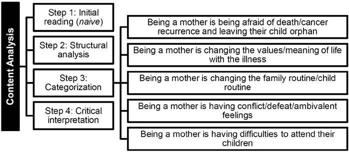 Foi utilizada uma ficha de dados sociodemográficos e clínicos para caracterizar as participantes, e foi realizada uma entrevista semiestruturada com cada uma delas. As questões norteadoras utilizadas no estudo foram: Para você, o que é ser mãe? Como é ser mãe e estar com câncer? Quais as principais dificuldades? Conta com o apoio/ajuda de quem para cuidar das crianças, no tratamento e nas demais atividades que exerce? Como percebe que seu/sua filho(a) está lidando com o fato de você estar doente? Você conversa com seu/sua filho(a) sobre sua doença e seu tratamento? O que ele(a) sabe? O que ainda não sabe? Para o presente artigo foram analisados todos os conteúdos que remetiam à experiência da maternidade e não foram examinados os conteúdos sobre a comunicação da doença com a criança, tendo em vista o objetivo do estudo.