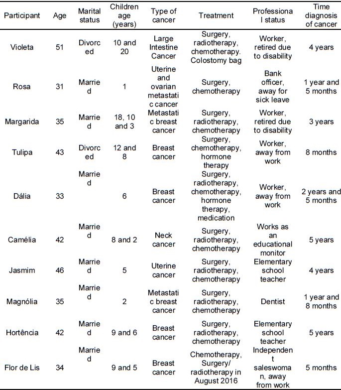 A escolha das participantes foi por conveniência entre as mulheres que faziam parte da Liga de Combate ao Câncer de uma cidade do interior do Rio Grande do Sul, ou seja, elas foram acessadas conforme foram sendo indicadas entre as moradoras da região. Foram identificadas 12 mulheres para participar da pesquisa, porém uma delas não aceitou participar e a outra foi excluída porque estava em fase de puerpério. Todas as mães foram entrevistadas nas suas residências. Os dados sociodemográficos e clínicos das participantes estão apresentados na Tabela 1.