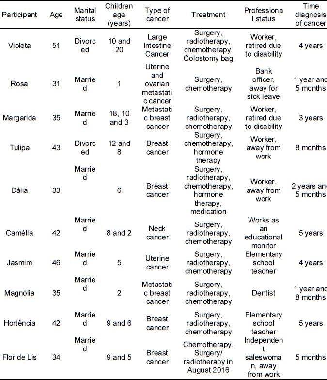 Estudo de caráter qualitativo exploratório (Creswell, 2007) com dez mães que estavam realizando tratamento para o câncer ou que finalizaram o tratamento nos últimos seis meses com ao menos um filho de até dez anos de idade participaram da pesquisa. Essa faixa etária foi escolhida porque, na infância, a criança tem maior dependência da mãe e necessita de cuidados, além do cuidado emocional, que envolvem atividades que requerem energia da mãe, como preparar os alimentos, ajudar a vestir-se, preparar o material para a escola, entre outros.