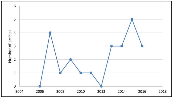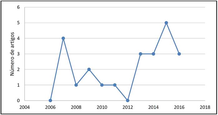 A partir de 2013 nota-se maior interesse dos pesquisadores sobre o assunto, com três publicações neste ano. Em 2014 e 2015, o número de publicações por ano continua crescendo, aumentando um por ano, demonstrando aumento interessante referente aos anos anteriores. Assim, no ano de 2014 encontram-se quatro artigos sobre o tema e, em 2015, cinco artigos. Em 2016 constatou-se a publicação de três artigos científicos.