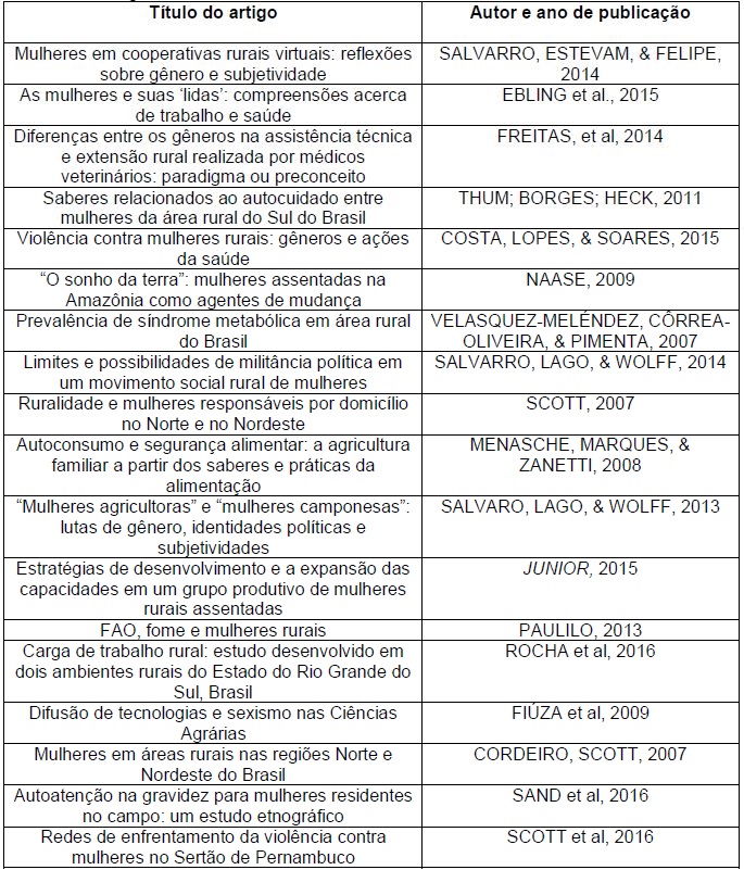 Deve-se destacar que dos 23 artigos selecionados para a amostra pelos critérios elencados, em 22 deles o endereço profissional dos autores é em universidades de Estados brasileiros e, em um artigo (Naase, 2009), a pesquisadora atua profissionalmente na Alemanha. Interessante observar que esta autora teve toda sua formação no exterior, mas seguiu pesquisando sobre a mulher brasileira, especificamente sobre a mulher trabalhadora rural. Este estudo internacional é um indicador da importância que tem essa população, porém o mapeamento das publicações também revela a invisibilidade destas mulheres que atuam no campo na maioria dos Estados do Brasil, embora tenhamos a presença das mulheres no trabalho rural em quase a totalidade do país.