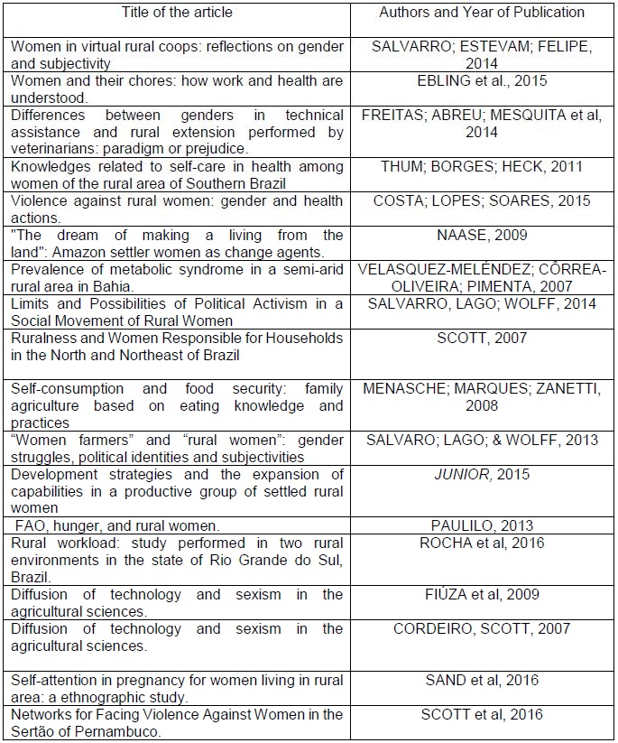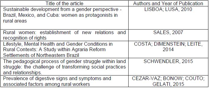 Em relação aos principais resultados dos artigos analisados, evidenciou-se alto número de publicações em relação aos movimentos das mulheres rurais em busca de seus direitos enquanto trabalhadoras. Os estudos trataram também da presença da mulher em movimentos sociais, como no MST (Movimento dos Trabalhadores Rurais Sem-Terra) e no MMC (Movimento de Mulheres Camponesas). Apresentaram-se, da mesma forma, as atividades exercidas pelas mulheres no campo, a invisibilidade destas em relação aos homens trabalhadores rurais, bem como a busca por algumas para aperfeiçoar seus conhecimentos no trabalho do campo.