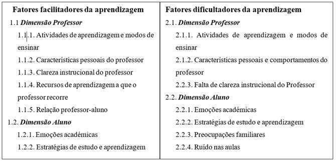 A partir do processo de codificação e categorização de dados, emergiram duas grandes categorias que contribuem como facilitadoras e dificultadoras da aprendizagem, segundo a perceção dos alunos: dimensão professor com 128 referências (85 facilitadoras e 43 dificultadoras) e dimensão aluno com 28 referências (11 facilitadoras e 17 dificultadoras).