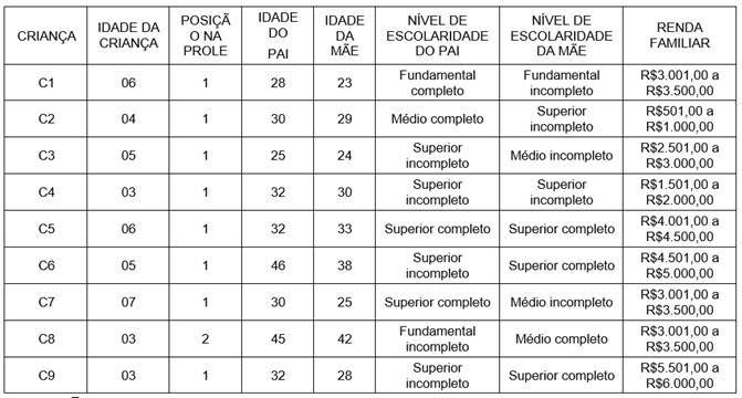 Quanto à idade das crianças, esta variou entre três a sete anos de idade. Em relação ao sexo da criança, apenas duas crianças eram do sexo feminino (C2 e C6). Apenas a criança C8 tinha um irmão mais velho, os demais eram os primogênitos e as crianças C1, C5, C6, C7 e C9 eram os únicos filhos do casal. Destaca-se que a figura paterna era representada pelo padrasto nas famílias das crianças C2 e C4. Houve variabilidade do nível de escolaridade e das profissões exercidas pelos membros do casal. Em relação à escolaridade da mãe, apenas uma tinha ensino fundamental incompleto (C1), as demais variaram entre ensino médio incompleto e ensino superior completo. Já o grupo de pais, apenas um deles tinha ensino fundamental incompleto (C8), um pai tinha o ensino fundamental completo (C1), um pai declarou ter concluído o ensino médio (C2) e os demais tinham ensino superior incompleto ou completo. Destaca-se que cinco mães (C3,C4,C6,C7,C8) declararam serem donas de casa e ficam responsáveis pelos cuidados do filho com TEA. Por outro lado, todos os pais (homens) declararam exercer atividade remunerada fora de casa, exceto o pai da C2 que está desempregado. Quanto aos dados sobre a renda familiar constatou-se que a maioria das famílias ganha aproximadamente de três a quatro salários mínimos. No entanto tiveram dois extremos sobre a renda familiar, uma família (C2) sobrevive apenas de um salário mínimo e outra que ganha mais de cinco salários mínimos.