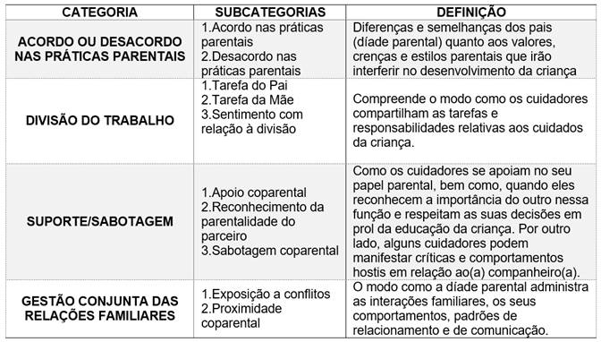 As palavras e/ou expressões emitidas pelos participantes foram transcritas em um editor de texto. Em seguida, o pesquisador iniciou o procedimento de pré-análise com uma leitura flutuante. Essa é considerada por um primeiro contato com o material coletado para se apropriar do conteúdo. A partir disso, a leitura dos dados se tornou mais clara e permitiu que as palavras e/ou expressões se encaixassem nas categorias. Ao final, realizou-se a análise propriamente dita e a categorização. A análise dessas entrevistas com os casais permitiu a construção de categorias conforme as dimensões do modelo teórico da estrutura interna e contexto ecológico da coparentalidade de Feinberg: acordo ou desacordo nas práticas parentais; divisão do trabalho relacionado à criança; suporte/sabotagem da função coparental e gestão conjunta das relações familiares (Feinberg, 2003). As definições das categorias estão descritas na Quadro 2.
