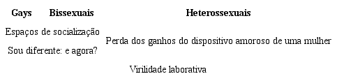 A seguir, será apresentada a descrição das quatro categorias encontradas e os trechos das entrevistas que as exemplificam. Os fragmentos das narrativas foram identificados com as seguintes siglas (G) gay, (B) bissexual e (Ht) heterossexual.