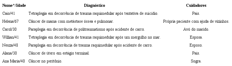 Foram considerados como critérios de inclusão: pacientes maiores de 18 anos, de ambos os sexos, que independentemente do diagnóstico, estivessem conscientes, orientados e demonstrassem disposição para conversar com a pesquisadora. Os encontros dialógicos foram iniciados com a seguinte questão norteadora “[...] estou interessada em compreender como é a experiência de estar sendo cuidado em casa. Você poderia me contar como tem sido para você?”. O participante era convidado a conversar abertamente sobre sua experiência com a pesquisadora. Os encontros não foram gravados ou registrados na íntegra, a fim de manter o desenho da pesquisa fiel ao método fenomenológico.