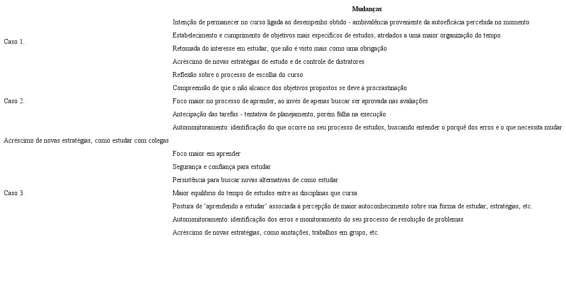 De início, notou uma mudança na sua forma de encarar os estudos, passando a apresentar mais persistência na busca por alternativas para sua aprendizagem; relatou que não conseguia equilibrar os horários de estudos e as demandas de forma a dar conta de todas as disciplinas. Por sua vez, na segunda entrevista, relatou maior organização de tempo e alcance dos objetivos propostos. Quanto ao seu foco de estudos, seguia com o objetivo de aprender o conteúdo e, para isso, estava se sentindo mais segura para experimentar novas estratégias de estudo. Por fim, no último momento, relatou maior segurança e confiança, inclusive para o semestre seguinte e identificou também maior foco nos objetivos, apesar dos imprevistos cotidianos.