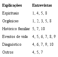 Os familiares não apresentaram um entendimento único e uniforme acerca do sofrimento psíquico, mas sim, diversas hipóteses e suposições, que apontaram múltiplas explicações dadas pelos mesmos, evidenciando o quão complexo é entender o sofrimento psíquico. Apenas na segunda e terceira entrevistas há apenas um tipo de explicação para o problema. Para os demais entrevistados (Tabela 1) não há uma única causa ou explicação para o sofrimento psíquico.