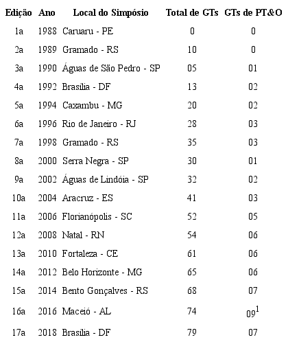 A Tabela 1 apresenta o detalhamento dos GTs de PT&O por cada Simpósio da ANPEPP. Nas primeiras três edições, o evento foi anual; a partir da quarta, tornou-se bianual. Na Tabela 1 é possível observar a evolução numérica de GTs voltados para o campo do trabalho e das organizações.