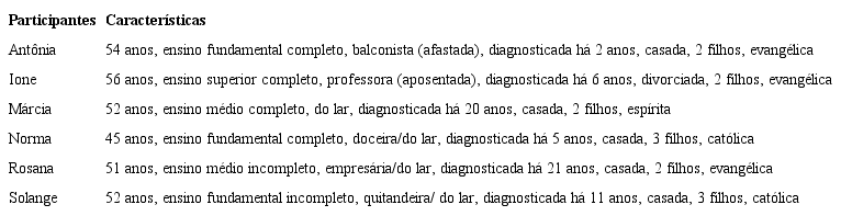 Participaram do presente estudo seis mulheres, as quais preencheram os seguintes critérios de inclusão: (1) apresentavam diagnóstico de fibromialgia há, no mínimo, seis meses, (2) possuíam de 40 a 60 anos de idade e (3) eram alfabetizadas. Não houve, portanto, restrições em relação a outras variáveis na seleção das participantes. Conforme a Tabela 1, a maioria delas se situava na faixa dos 50 anos de idade e se dedicava às atividades do lar, sendo que houve certa diversificação quanto ao nível de escolaridade e ao tempo de diagnóstico. A Tabela 1 ainda revela que a maioria era casada, que todas tinham filhos e que três delas se identificaram como evangélicas, duas como católicas e uma como espírita.