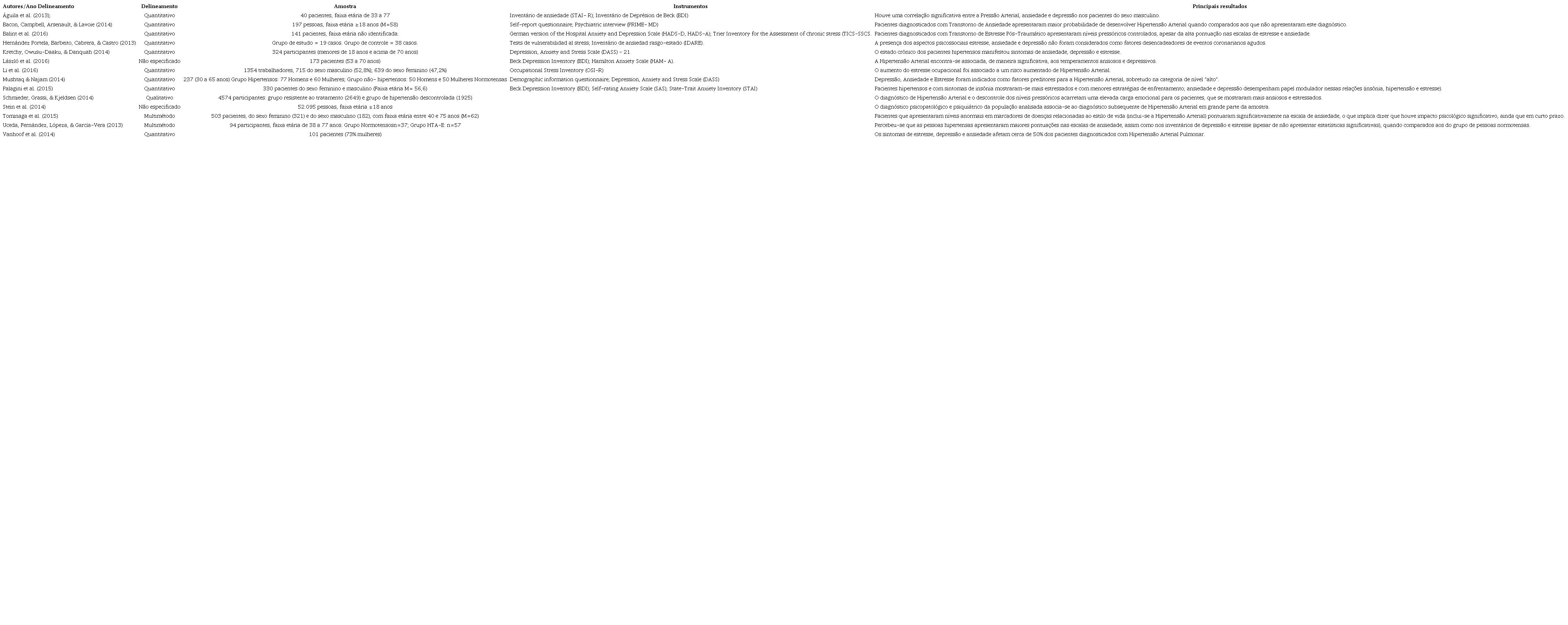 No tocante à amostra, participaram homens e mulheres, com e sem diagnóstico prévio de HA, com idades que variaram entre 16 e 75 anos. Faz-se notório ainda a diversidade de ambientes e contextos que os estudos foram desenvolvidos, dentre eles, hospitais universitários e gerais, clínicas, e ambientes de trabalho dos participantes, como indústrias petrolíferas.