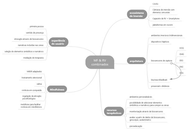 Na forma combinada de RV e mindfulness (VRMF), os estudos cobrem o uso experimental de a) ambientes tridimensionais projetados para MF com RV; b) ambientes imersivos multimodais com dispositivos hápticos que facilitam o sentido de presença ao proporcionar informação sensorial; c) ambientes imersivos com biossensores que facilitam a consciência propioceptiva e d) uso de sensores de bio e neurofeedback6 para interação nas cenas a partir de parâmetros fisiológicos. O biofeedback como fonte de dados que produz mudanças nas cenas procura um grau de interação maior do sujeito com o ambiente virtual. Para o trabalho de regulação atencional, as pesquisas apontam que a interação com parâmetros fisiológicos em tempo real no ambiente virtual facilita o sentido de presença, a consciência e o estado de atenção plena. Contudo, tais recursos ainda estão restringidos aos laboratórios, não sendo habituais em sistemas de RV clínicos disponíveis no mercado. A Figura 1 a seguir sintetiza, de maneira cartográfica, os resultados da análise realizada.