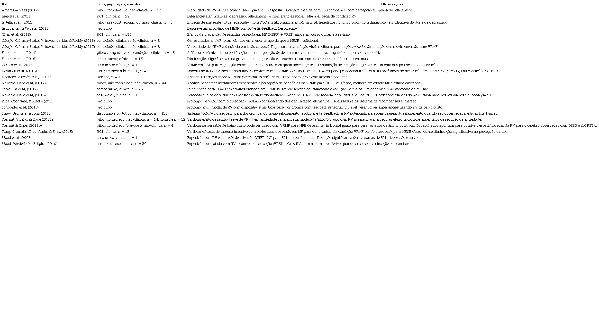 Localizamos uma revisão sistemática sobre mindfulness e RV (Modrego-Alarcón et al 2016), cobrindo 10 trabalhos que utilizam a RV para aprendizagem da atenção plena. Os autores concluem que a RV pode facilitar a aprendizagem e a prática de mindfulness em populações clínicas e não-clínicas, e sinalizam a necessidade de estudos controlados randomizados (RCT) e com amostras maiores. Não localizamos metanálises. A maioria dos artigos apresenta estudos pilotos com amostras pequenas. Três apresentam desenho controlado randomizado (um deles utiliza uma amostra de 180 sujeitos (Chen et al, 2018)). Outros descrevem estudos comparativos de condições experimentais ou com grupo controle, mas não cumprem os critérios RCT. Outros apresentam relatos de caso único ou descrevem estudos baseados na prática clínica, investigando a eficácia de tratamentos que incluem RV e mindfulness. Analisamos também artigos sobre protótipos e arquiteturas para mindfulness com RV (VRMF), e artigos de desenvolvimento teórico e validação de constructo.