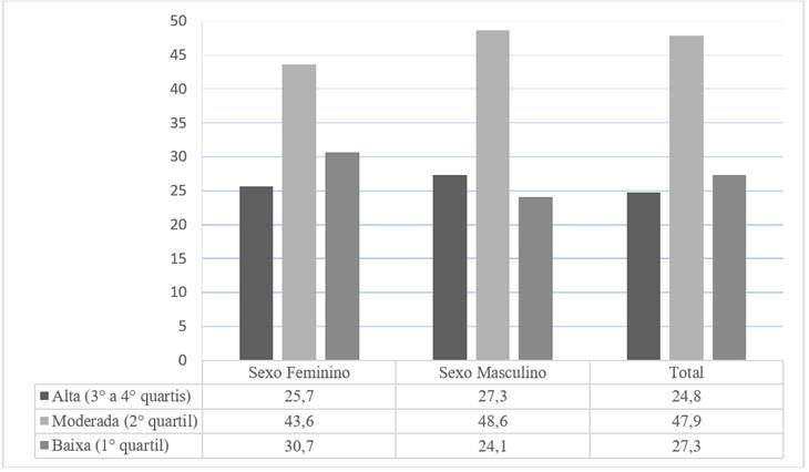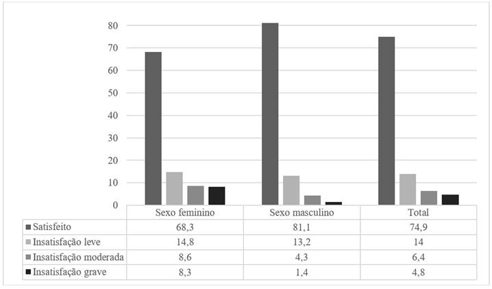 Neste estudo, observou-se prevalência de 27,3% de baixa, 47,9% de moderada e 24,8% de alta autoestima nos participantes. As proporções da autoestima se apresentaram semelhantes entre os sexos (Figura 1). A prevalência de IIC foi de 25,2%, com maior proporção identificadas nas meninas (18,9% entre os meninos e 31,7% entre as meninas) (Figura 2).