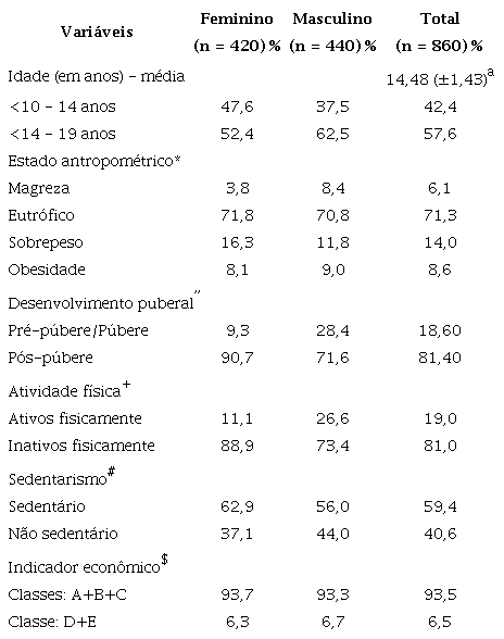 Entre os 860 adolescentes pesquisados a média da idade foi de 14,48 anos (DP = 1,43), com maior percentual observado entre aqueles com idade entre 14 e 19 anos. Quanto ao estado antropométrico, 71,3% dos adolescentes tinham eutrofia, 6,1% magreza e 22,6% excesso de peso. A maioria era pós-púbere (81,40%), inativo fisicamente (81,0%), tinham comportamento sedentário (59,4%) e pertenciam ao melhor estrato socioeconômico (93,5%). A distribuição das características demográficas, psicológicas, biológicas, econômica e do estilo de vida, segundo o sexo, podem ser visualizados também na Tabela 1.