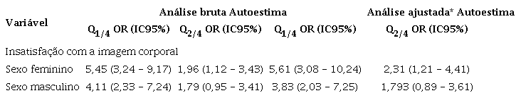Resultados: Entre os adolescentes, 24,8% tinham moderada autoestima e 27,3% apresentaram os menores escores desse constructo. A insatisfação com a imagem corporal foi identificada em 25,2% dos adolescentes. A análise de associação revelou que adolescentes com insatisfação com a imagem corporal possuem 5,61 (IC 95% 3,08-10,24) vezes maior chance em manifestar baixa autoestima para o sexo feminino e 3,83 (IC 95% 2,03-7,25) vezes para o sexo masculino. Ainda entre as meninas, a insatisfação com a imagem corporal permaneceu associada positivamente à moderada autoestima após ajuste do modelo (OR: 2,31; IC 95% 1,21-4,41).