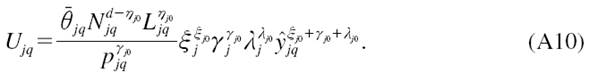 in which ƞj0, ξj0, Yj0, and λj0 are the elasticities of utility of the consumer in country j with regard to the lot size, capital good, services, and savings in region ( j, q). We call ƞj0, ξj0, Yj0, and λj0 the propensities to consume lot size, capital good, and services, and to hold wealth (save), respectively. In (8), θjq(t) is called region ( j, q)'s amenity level. Amenities are affected by infrastructures, regional cultures and climates (e. g., Kanemoto, 1980; Diamond and Tolley, 1981; Blomquist, et al. 1988). Following Zhang (2016), we assume that amenity is affected by population. We specify θjq as follows