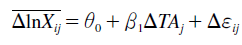 (7)Therefore, we regress the change of the log of (average) regional bilateral exports on the change in the TA variable for the case of the EU exporters 16. The exercise is identical for the CAN-Mercosur integration in 2005 for Argentina and Brazil, although in that case the periods before and after the change are 2000-2004 and 2005- 2008, respectively 17.