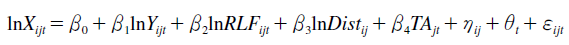(2)Where hij is a country-pair fixed effect to capture all time-invariant bilateral factors influencing nominal trade flows; dit and }jt are exporter-time and importer-time fixed effects, respectively, to capture time-varying exporter and importer GDP, as well as all other time-varying country-specific effects that are unobservable in i and j and that influence trade, including the exporter’s and importer’s MR.