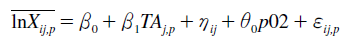 (1)Where ln denotes natural logarithms; Xijt is the value of the aggregate export flow from country i to country j in year t; GDPit (GDPjt) is gross domestic product, or GDP, in country i (j) in year t; DISTij is the bilateral distance between the economic centres of i and j; ADJij is a dummy variable assuming a value of one if the two countries share a common land border (and zero otherwise); LANGij is a dummy variable that takes a value of one if the two countries share a common language; TAijt is a variable indicating whether there is a TA between the two countries in year t, and lnP1–d (lnPji1–d) is exporter i’s (importer j’s) non-linear and unobservable MR term.
