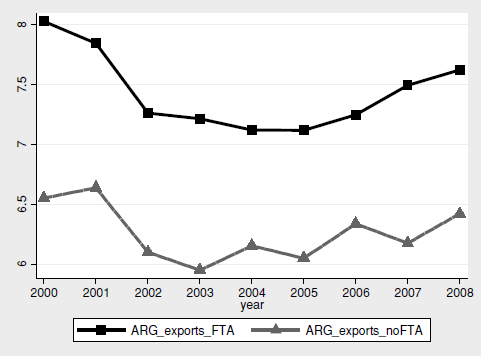 We determine the existing TAs that involve the two EU member states and those involving the two Mercosur members during the period 2000-2008. To do so, we use the database on Economic Integration Agreements8 available from the Bergstrand’ webpage (http://www3.nd.edu/~jbergstr). We then construct a TA binary variable to explore the evolution of national exports and the existence (or non-existence) of TAs.