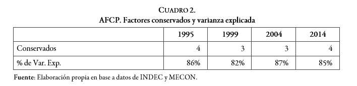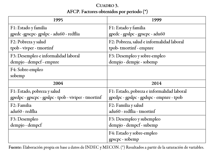 A partir de los resultados del AFCP, se muestran en el cuadro 3 a continuación las variables que integran factor en cada periodo22: