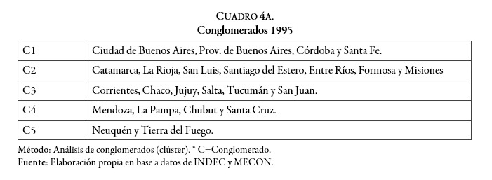 El análisis comienza en 1995, en el cuadro 4a a continuación se distinguen cinco grupos de provincias. En el primer conglomerado, se concentran aquellas que reúnen el 62% de la población del país y el 72% de su producto bruto. La exclusión tiene rasgos laborales y familiares, a través de mayores tasas de desempleo en cabezas de familia, tasa de dependencia de adultos mayores y hogares con débiles redes familiares. De igual modo, la dimensión laboral es central en los grupos 3 y 4. Tan fuerte incidencia se explica por las transformaciones en el mercado laboral acaecidas en la década en un contexto de apertura comercial indiscriminada, en especial para el primer grupo, por su naturaleza industrialista e intensiva de mano de obra. Bekerman y Sirlin (1996) concluyen que el patrón dual de comercio que se presentaba históricamente en el país se profundizó en dichos años con una primarización de las ventajas comparativas, en desmedro de las industrias de media y alta tecnología. En el grupo 3 estos efectos se traducen en mayores tasas de desempleo y de informalidad, a las que suman altas tasas de pobreza por ingresos y de mortalidad infantil; y en mayores tasas de sobre-empleo horario en el grupo 4.