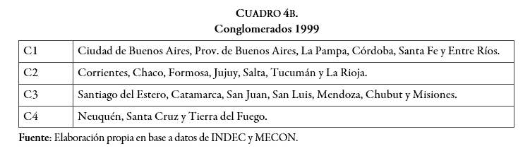 Fuente: Elaboración propia en base a datos de INDEC y MECON.Para 1999, se identificaron cuatro grupos según indica el cuadro 4b. En el primero, se destaca el componente económico – relacional, con una mayor tasa de dependencia de los adultos mayores y más hogares con desintegración familiar. El envejecimiento poblacional en las provincias más numerosas (con participación de adultos mayores un 25% superior a cualquier otra región) permite explicar parte de estos determinantes.