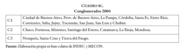 Consideramos ahora los resultados para 2004, en un marco de recuperación de los indicadores sociales (a finales del año, pobreza e indigencia caían al 52% y 17% luego de 58pp y 21pp un año antes). El desempleo se ubicaba por debajo de los 15 puntos bajo reactivación en la actividad económica. La cantidad de grupos identificados para este año se reduce a un mínimo de tres, y se eleva la heterogeneidad entre las provincias que los componen (ver cuadro 4c). El conglomerado 1 reúne 11 provincias, con prevalencia de dimensiones laborales y familiares, por mayores tasas de desempleo abierto (en jóvenes y cabezas de familia), de subempleo e informalidad laboral. Gasparini (2005) muestra que el débil mercado laboral de entonces implicó menos horas de trabajo para las personas menos calificadas y una caída significativa en las tasas de cobertura de la seguridad social. Esto se combinó nuevamente con altas tasas de pobreza y de mortalidad infantil, fuerte dependencia de adultos mayores y una mayor porción hogares con desintegración familiar.