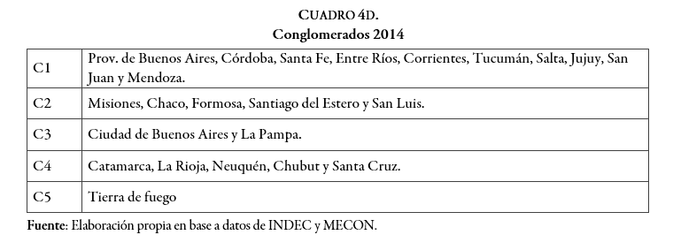 En el cuarto grupo, las provincias revelan tasas de empleo no registrado y de hogares con desintegración familiar superiores al resto de los agrupamientos (en el primer caso la tasa de informalidad en el grupo asciende a 39% en 2014, 9 puntos por encima de la tasa nacional); y en el grupo nº5, Tierra del Fuego encuentra en los gastos sociales los determinantes principales de su exclusión.