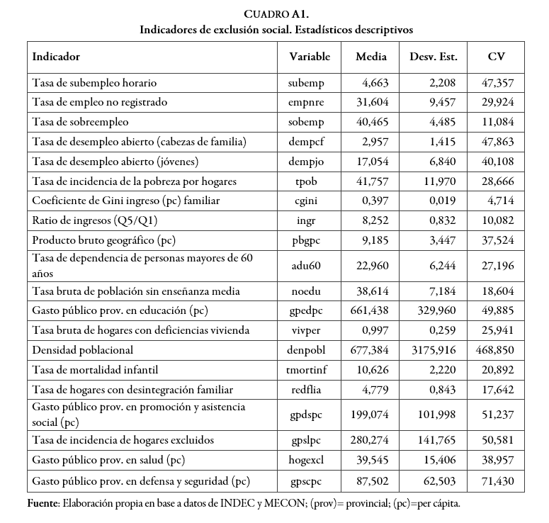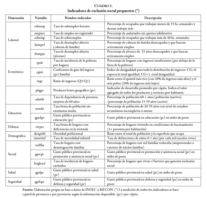 A nivel regional, se combina el estudio de la exclusión con la vulnerabilidad, la pobreza, la precariedad social, la calidad de vida, o el hábitat (García & Velázquez, 1999; Perona & Rocchi, 2001). Cicowiez (2003) se distingue al emplear análisis factorial de componentes principales para articular un ranking de provincias en base a tres indicadores. Además, dos antecedentes directos de este artículo proponen mediciones operativas de la exclusión en Argentina: Juárez Jerez, Perona, Pereyra, Navarrete & Ochoa (2010) y Pereyra (2015)10. Aún así no se identificaron mediciones operativas específicas y periódicas sobre exclusión para Latinoamérica o Argentina11.