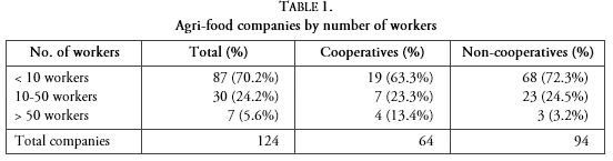 A subsample of 124 agri-food firms was obtained from the total sample4 which represents 9% of the total number of agri-food companies in the region this year5. Overall, 70% of the companies have fewer than 10 employees and 24.2% have between 10 and 50 employees, so small-sized companies predominate which points out to the high degree of fragmentation within the agri-food industry6. With regard to the legal form, 24.2% of the analysed companies (30) are cooperative companies which represents 10.3 % of the total number of cooperatives in the region attending to dates from 2012 (OSCAE, 2013). Comparatively, cooperative companies have a relative size greater than non-cooperative ones. Table 1 shows the sample according to the number of workers.