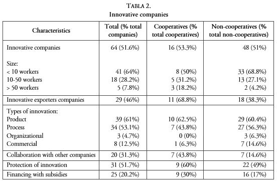 Firstly, with regard to the innovative activity, 51.6% of the companies reported to have undertaken some innovation activities in the last 2/3 years. 64 % of them have fewer than 10 employees and 92.2% fewer than 50 employees. The innovative activity is slightly higher in cooperatives (53.3 % of the total of cooperatives) than in non-cooperative companies (51 % of the total of no cooperatives). Furthermore, the main differences detected between cooperative companies compared to non-cooperatives are that the first ones are more export-oriented (68.8% against 38.3%)7 and comparatively, they develop further product-innovations (62.5% against 60.4% of non-cooperative companies) whilst the percentage of non-cooperative companies that support process innovations is higher (56.2% against 43.8% of cooperatives). Another noteworthy difference between cooperative and non-cooperative companies is the higher level of collaboration for innovation with other companies (43.8% compared to 14.6% of non-cooperative). Overall, the percentage of innovative agri-food companies that collaborate is reduced (31.3%). Cooperative companies use more protective systems of innovation (60% against 49% of non-cooperatives). The higher percentage in terms of public funding in cooperative companies compared to non-cooperative ones is another interesting aspect to emphasize (30% opposite 17% of non- cooperative ones).8Table 2 summarizes these aspects.