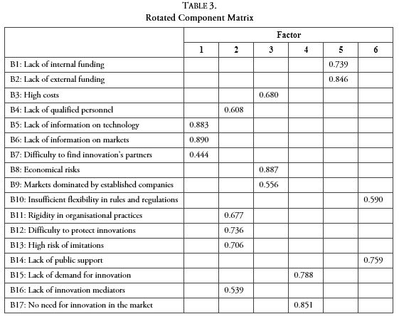 Factor 5: The fifth component explains 5.7% of variance and it is related with the barriers “lack of internal funding” and “lack of external funding” variables. This is a factor related to “Obstacles to innovation motivated by financial constraints”.