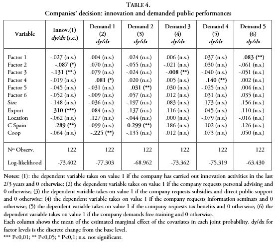 Neither the existence others barriers to innovation nor the company’s characteristics affect the demand for information seminars (Demand 3), so there are no differences between the firms in this type of demanded action from the public administration (Table 4, column 5, model 4).