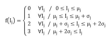 f(Iij) = discrete function, in intervals defined as a function of the mean μj and standard deviation σ of the variable I in province i and that takes the following values: