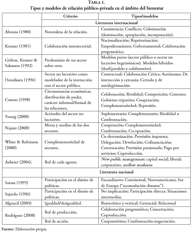 La literatura especializada es fecunda en estudios acerca de la interacción público-privada en el ámbito del bienestar, si bien las aproximaciones varían mucho en cuanto a su naturaleza, el esquema teórico de aproximación, los referentes empíricos analizados y la posibilidad de extrapolación de sus conclusiones. En su conjunto, los trabajos publicados evidencian la existencia de algunos contextos en los que las políticas de bienestar se diseñan e implementan hegemónicamente por un solo sector -el público o el privado- (modelo puro) y de otros en los que ambas tareas son compartidas por los diferentes sectores (modelo híbrido o mixto) (Gidron, Kramer & Salomon, 1992). Sin embargo, un análisis más detallado permite inferir la existencia de, al menos, cuatro líneas de investigación que ponen el foco en los siguientes aspectos (Prieto, 2011): a) los condicionamientos socioculturales y económicos que influyen o determinan la naturaleza y el alcance de esta relación; b) los motivos o razones que se encuentran detrás del interés de los diferentes agentes implicados; c) las disposiciones (metas, estrategias, actitudes) expresadas por ambos sectores; y d) las manifestaciones y variantes de estas relaciones, muchas veces estructuradas en torno a modelos o tipologías de alcances y orientaciones diversas.
