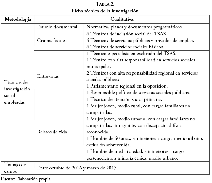 La metodología empleada en esta investigación es de naturaleza cualitativa. La elección de esta metodología se ha visto lógicamente condicionada, en primer lugar, por la naturaleza del objeto de análisis: las relaciones entre el sector público y el TSAS en las políticas de inclusión social en la región española de CyL. Por su parte, también obedece lógicamente a la naturaleza de los propios interrogantes iniciales de la investigación, centrados en torno a la manera de entender y plantear el papel desempeñado en materia de inclusión social por parte de cada uno de estos actores, así como en la visión que cada uno de ellos tiene respecto a las relaciones que mantienen entre sí. Se trata, por tanto, de un propósito que implica indagar en el lado subjetivo de la vida social, en el modo en que las personas se ven a sí mismas y a su mundo (Taylor, Bogdan & Devault, 2016). Con el fin de llevar a cabo un acercamiento más comprensivo de la realidad a analizar, y siguiendo a Rodríguez (2005), se ha recurrido a la estrategia de la triangulación metodológica, desplegándose para ello cuatro técnicas de investigación social de naturaleza y orientación diferentes: el estudio documental, el grupo focal, la entrevista individual y los relatos de vida.