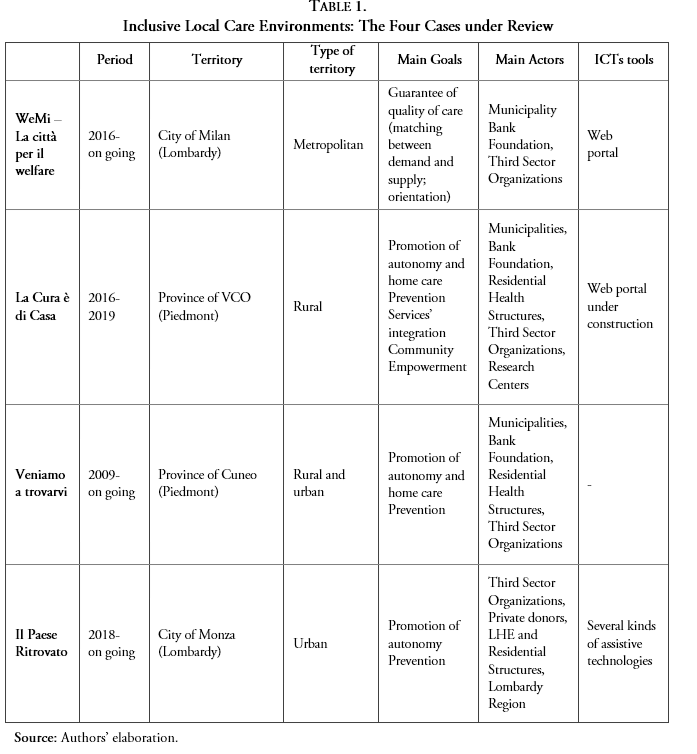 The article proceeds as follows. Section 2 addresses the most recent academic literature on social innovation to develop a working definition of socially innovative LTC and elderly care policies and to conceptualize the notion of an “inclusive local care environment”. Section 3 presents a comparative overview, relying on a common analytical grid, of four selected cases of socially innovative LTC measures run at the local level in Lombardy and Piedmont. Section 4 finally turns to interpretation and concludes by advancing and discussing three explanatory hypotheses that help to shed some light on the factors that favored the setup of socially innovative solutions in the local contexts under review.