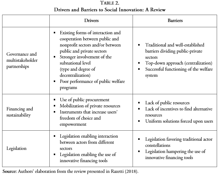Against this backdrop, building on an in-depth review of the main findings of existing comparative studies, Table 2 offers the first collection of those factors that have been acknowledged by the literature as possible “drivers” or “barriers” to social innovation. The list may be organized by looking at a multiplicity of dimensions, ranging from aspects concerning local governance settings to institutional features and legal constraints.