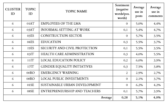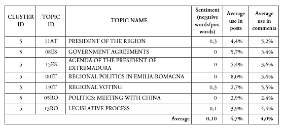 We named cluster number 5 Politics, as it collects seven topics from four national cases that specifically deal with the agenda of the president of the region (as in 11AT and 15ES), regional voting (as in the case of 19IT), regional politics and legislative processes (as in the cases of 08ES, 00IT, and 13RO) or political meetings (05RO). These topics are slightly more used in posts (4,7%), than in comments (4,0%) and, on average, have quite a positive sentiment. Nonetheless, the two topics within this cluster which have a more negative sentiment are the ones used more in comments. This cluster tell us that a minor debate on cohesion policy regards its relation with politics.
