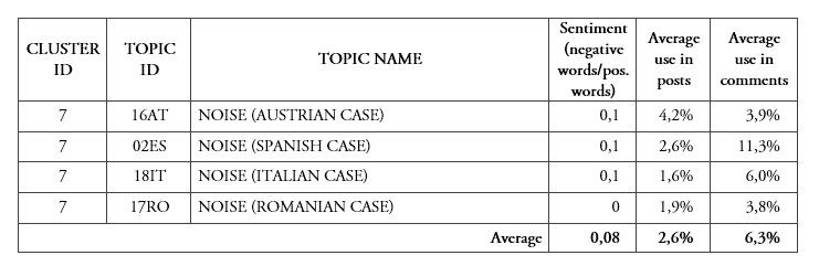 Overall this cluster is very interesting: first of all, we trace similar topics in several national cases, with the only exception of Poland. Secondly, most of these topics are very negatively loaded in terms of sentiment, and are used more in comments than in posts. Interestingly, the topics making critical remarks are the mostly internationally distributed.
