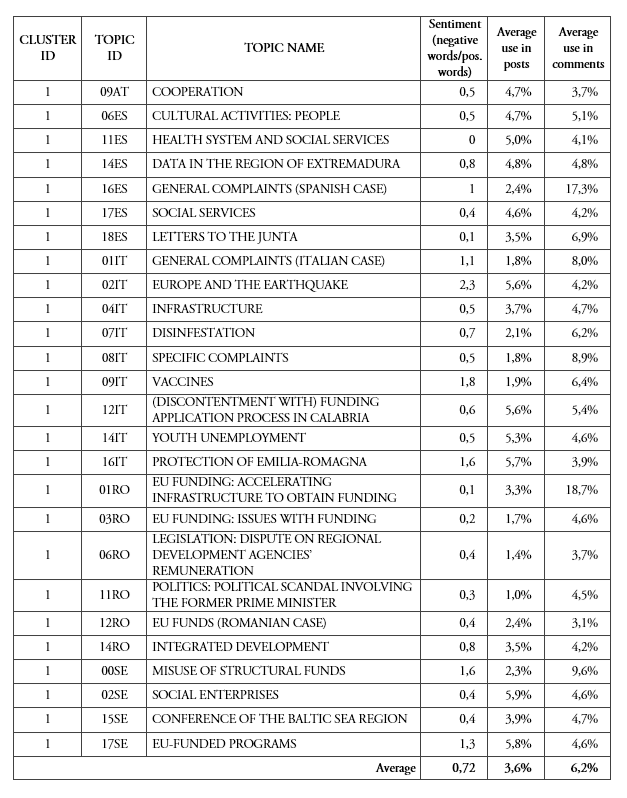 From a methodological point of view, we propose a three-step procedure to analyze the European public sphere. In a first step, we induced topics from discourse that takes place in different countries. In this vein, while in previous studies on cohesion policy, researchers analyzed discourses with the aim of recognizing frames that tend to be given (Triga & Vadratsikas, 2018), we reconstructed the meaning inductively. Second, we characterized topics through sentiment analysis. In this step, also, we qualitatively inquired topics’ characteristics, so as to better understand them. Third, we qualitatively clustered topics according to the way they are used in communication on LMAs’ Facebook pages. This step was meant to assess the international distribution of topics in clusters. In other words, we examined the extent to which topics in the same cluster were elicited in different countries. In this way, we could speculate about the different international articulations of specific discourses. For example, clusters 1 and 2 are mostly used in comments. Cluster 1, moreover, which comprises more topics and from more countries (five in total), is the most negatively charged. On the other hand, clusters 3 and 4 are mainly used by LMAs. Cluster 3, in particular, aggregates topics from all the national cases. We suggest that, in particular, clusters 1 and 3 capture discourses that span over different countries and, therefore, elicit segments of a European public sphere. Finally, thanks to our methodology, we are able to directly take into account the tensions between fragmentation and aggregation of discourses at the level of civil society: the social impact of such a methodology is relevant, as it is able to take into account not only what the elite is thinking or writing (which is the case with newspaper analysis) but also comprises citizens’ voices. Of course, this is a first step, and future research might better disentangle the relationship between institutional communication and citizens’ responses4.