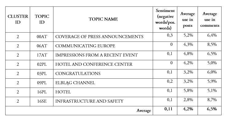 The first cluster, that we named Euroscepticism and negative interaction with audiences3, comprises topics from five national cases: only the Polish case is not included. On average, topics in this cluster have the most negative sentiment in our sample. Also, the cluster comprises topics which on average are much more used in comments than in posts. The average usage for comments of topics pertaining to this cluster is 6,2%, while the average usage for posts of topics is 3,6%.