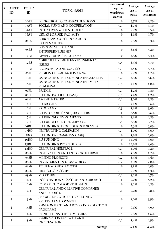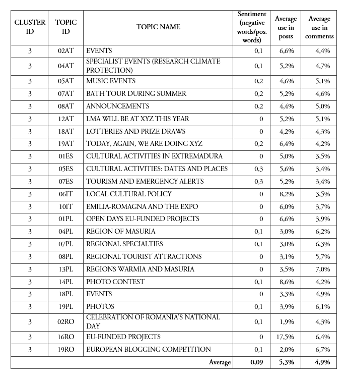 Clusters 3 comprises topics that are mostly used in posts made by LMAs to communicate and disseminate cohesion policy. In particular, it collects topics dealing with events, festivals, tourism, competitions, photos, postcards and, in general, ‘light-hearted’ ways of positive communication related to cohesion policy. This cluster, labeled Tourism, events, prizes, collects topics from five countries and has, on average, the most positive sentiment in our sample. All the topics in this cluster have a similar focus: 02AT, ‘Events’, 04AT, ‘Specialist events’, 12AT, ‘ LMA will be at xyz this year’, 05ES, ‘ Cultural activities: dates and places’, 01PL, ‘Open days EU-funded projects’, and 02RO, ‘Celebration of Romania’s national day’, for example, all deal with specific events. 18AT, ‘Lotteries and prize draws’, and 19RO, ‘European blogging competition’, instead, focus on competitions and raffles. 04PL, ‘Region of Masuria’, 07PL, ‘Regional specialties’, and 13PL, ‘Regions Warmia and Masuria’ are used to describe the beauty of Masuria, its dishes and specialties. Similar topics advertise the beauty of the regions under analysis: this is the case, for example, for 07AT, ‘Bath tour during summers’, 01ES, ‘Cultural activities in Extremadura’, and 06IT, ‘Local cultural policy’. Overall, topics within this cluster seem to be a shortcut to talk about cohesion policy: although they speak of cohesion policy-related or funded events, the topics do not emphasize the core of cohesion policy, such as operational programs, open calls and further initiatives.