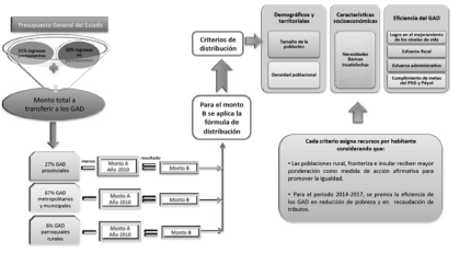 Jarrin Feijóo (2014), realiza un análisis para el periodo 2011-2013 del Modelo de Equidad Territorial en el que, entre otras conclusiones, determina que «la descentralización debe ser concebida como un proceso necesario que aporta al desarrollo local. Sin embargo, su éxito depende de una reforma institucional en diferentes instancias (implica el buen manejo tanto de: recursos financieros, talento humano, material y tecnológico); y, además, involucra la capacidad de gestión de las autoridades de los gobiernos locales y la participación de la sociedad civil» y destaca que las GADs con altos índices de NBI 4, bajos ingresos y territorios con más del 50% de población rural y ubicadas en la región amazónica e insular son las que reciben mayores
